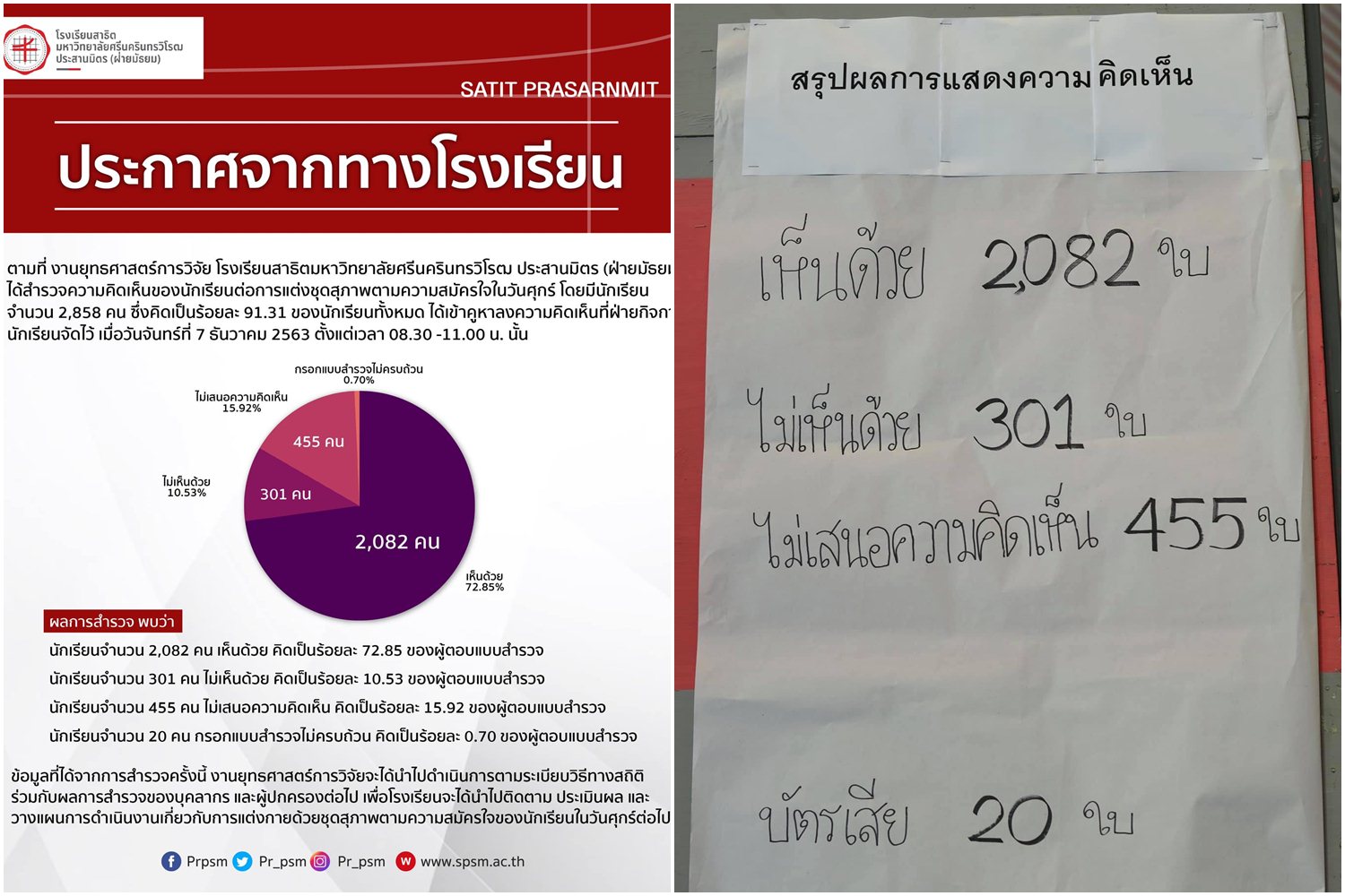 เมื่อวันที่ 7 ธ.ค. 63 เพจเฟซบุ๊ก โรงเรียนสาธิต มศว ประสานมิตร (ฝ่ายมัธยม) ได้เผยแพร่ข้อความระบุว่า ตามที่ งานยุทธศาสตร์การวิจัย โรงเรียนสาธิตมหาวิทยาลัยศรีนครินทรวิโรฒ ประสานมิตร(ฝ่ายมัธยม) ได้สำรวจความคิดเห็นของนักเรียนต่อการแต่งชุดสุภาพตามความสมัครใจในวันศุกร์ โดยมีนักเรียนจำนวน 2,858 คน ซึ่งคิดเป็นร้อยละ 91.31 ของนักเรียนทั้งหมด ได้เข้าคูหาลงความคิดเห็นที่ฝ่ายกิจการนักเรียนจัดไว้เมื่อวันจันทร์ที่ 7 ธันวาคม 2563 ตั้งแต่เวลา 08.30 -11.00 น. นั้น