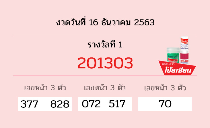 ผลสลากกินแบ่งรัฐบาล งวดวันที่ 16ธ.ค.2563 รางวัลที่1คือ 201303 เลขหน้า3ตัว 377 / 828 เลชท้าย3ตัว 072 / 517 เลขท้าย2ตัว 70
