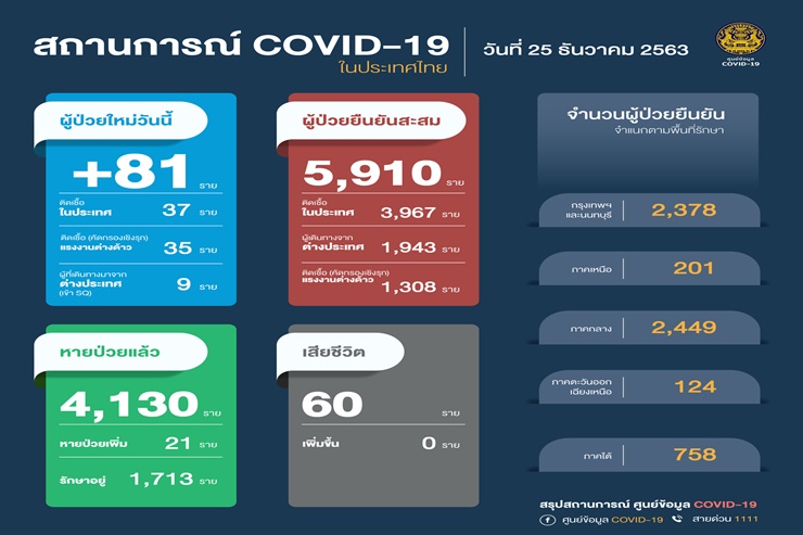 ศูนย์บริหารสถานการณ์โควิด19 (ศบค.) รายงานสถานการณ์แพร่ระบาดโควิด-19 ประจำวันที่ 24 ธันวาคม 2563 เวลา 11.00 น.