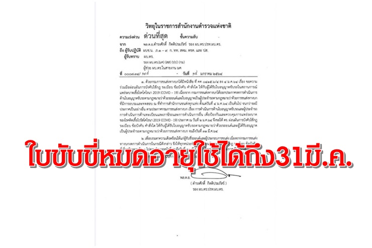 มีรายงานว่า สำนักงานตำรวจแห่งชาติ ซึ่งลงนามโดย พล.ต.อ.ดํารงศักดิ์ กิตติประภัสร์ รอง ผบ.ตร. ได้มีหนังสือวิทยุในราชการด่วนที่สุด ลงวันที่ 14 มกราคม 2564 ถึงผู้รับปฏิบัติ ผู้บัญชาการตำรวจนครบาล (ผบช.น.) ตำรวจภูธร ภาค 1-9 ตำรวจตรวจคนเข้าเมือง ตำรวจท่องเที่ยว ตำรวจตระเวนชายแดน ตำรวจปราบปรามยาเสพติด โดยให้ทุกหน่วยงานพิจารณาผ่อนผันการบังคับใช้กฎ ระเบียบ ข้อบังคับ ตามที่กรมการขนส่งทางบก ได้งดการดำเนินการด้านใบอนุญาตขับรถตามกฎหมายว่าด้วยรถยนต์และใบอนุญาตเป็นผู้ประจำรถตามกฎหมายว่าด้วยกรมการขนส่งทางบก จนถึงวันที่ 31 มีนาคม 2564 หรือจนกว่าจะมีประกาศเป็นอย่างอื่น เพื่อทราบและดำเนินการในส่วนที่เกี่ยวข้อง