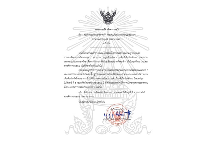 สำนักพระราชวัง แถลงการณ์ ฉบับที่ 4 กรมสมเด็จพระเทพรัตนราชสุดา ฯ พระอาการดีขึ้น เสด็จกลับวังสระปทุม 5 กพ.นี้