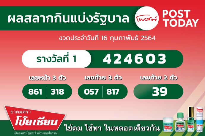 ผลรางวัลสลากกินแบ่งรัฐบาลงวดวันที่ 16ก.พ.64 รางวัลที่1 คือ 424603 เลขหน้า3ตัว 861 / 318 เลขท้าย3ตัว057/817 ท้าย2ตัว 39