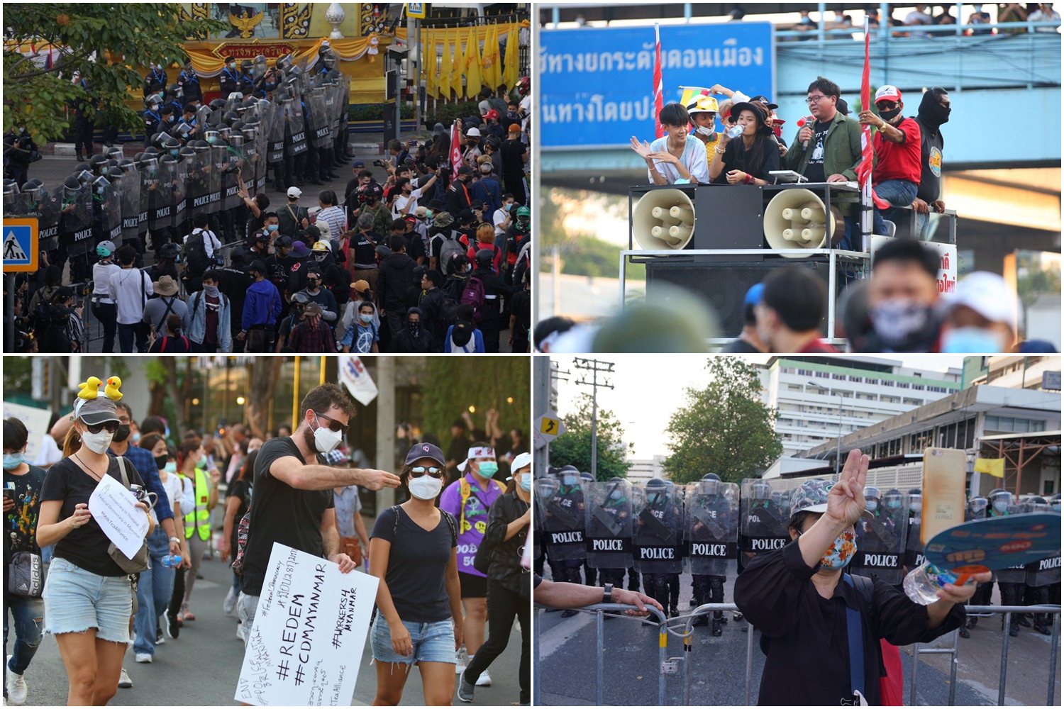 เจ้าหน้าที่ตำรวจตรึงกำลังบริเวณหน้าโรงพยาบาลทหารผ่านศึก ม็อบชู3นิ้วใส่พร้อมโห่ไล่ขณะเคลื่อนขบวนผ่านเพื่อมุ่งหน้าไปกรมทหารราบที่1 พบต่างชาติโผล่ร่วมม็อบ