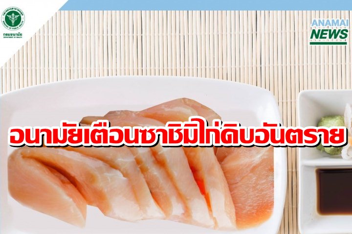 กรมอนามัย เตือนกินซาชิมิไก่ดิบอันตราย เสี่ยงได้รับเชื้อแบคทีเรีย ท้องร่วง อาหารเป็นพิษ ติดเชื้อในลำไส้ แนะ ควรกินแบบปรุงสุกด้วยความร้อนสูงกว่า 70 องศาเซลเซียส ในเวลาไม่น้อยกว่า 5 นาที