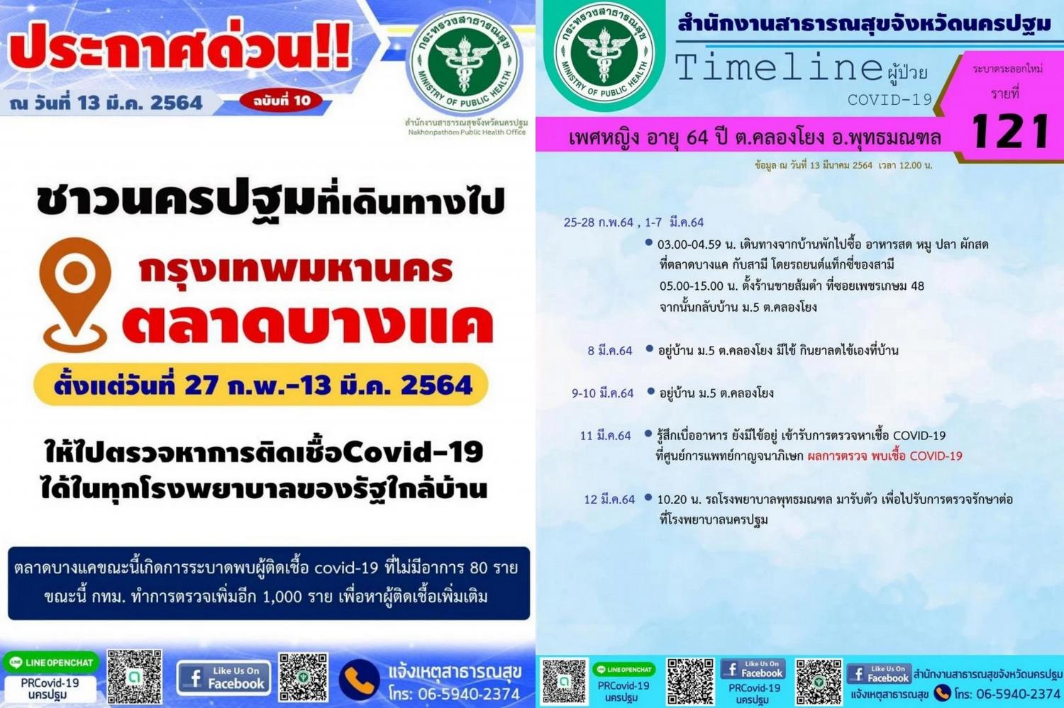 ประกอบกับผู้ติดเชื้อรายใหม่ของจังหวัดนครปฐม มีประวัติการเดินทางไปยังตลาดบางแค ซึ่งไทม์ไลน์ของผู้ติดเชื้อโควิด -19 ดังนี้