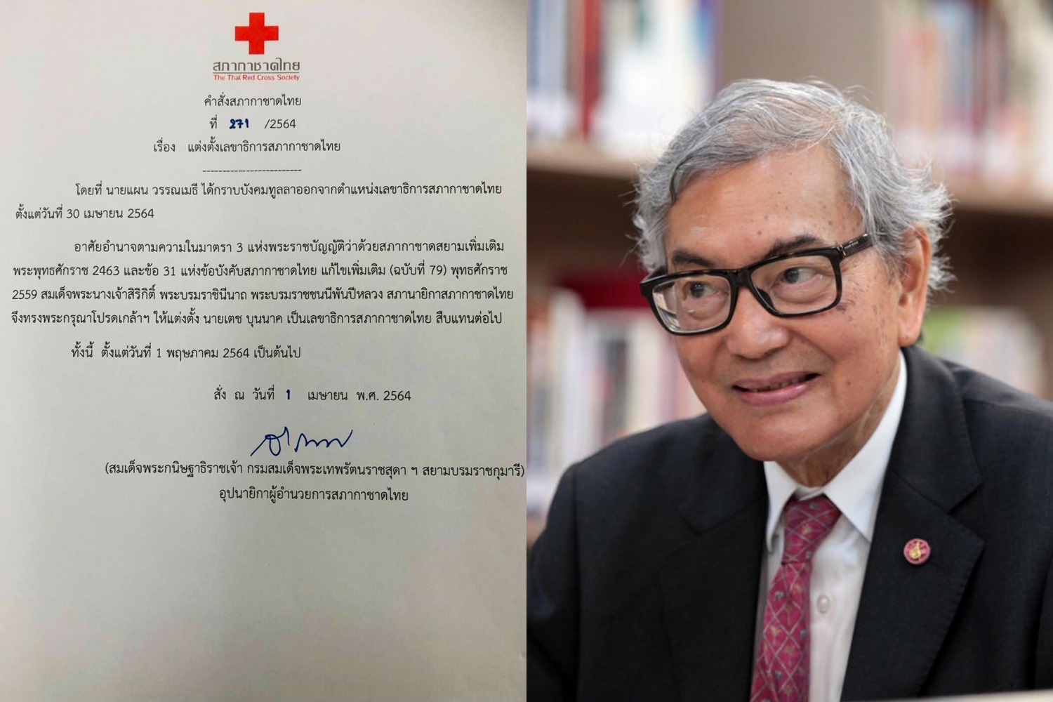สภากาชาดไทยเผยแพร่คำสั่งโปรดเกล้าฯแต่งตั้ง"เตช บุนนาค"นั่งเลขาธิการฯแทน"แผน วรรณเมธี" มีผล 1พ.ค.64