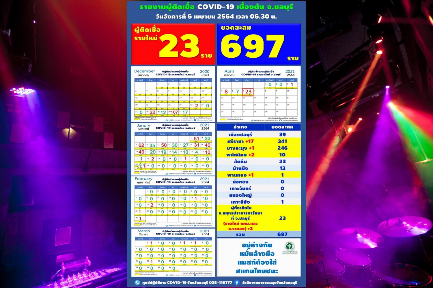 เมื่อวันที่ 6 เมษายน สำนักงานสาธารณสุขจังหวัดชลบุรี รายงานว่า พบผู้ติดเชื้อโควิด-19 เพิ่มเติม 23 ราย 1.เป็นผู้สัมผัส Cluster ที่ไปเกี่ยวข้องกับร้านคริสตัลผับ กทม. 17 ราย (เป็นชาวญี่ปุ่น 4 ราย ชาวไทย 13 ราย) และเป็นพนักงานในร้านคริสตัลผับ กทม. อีก 1 ราย สรุป Cluster นี้มีผู้ติดเชื้อโควิด-19 แล้ว 32 ราย โดยเป็นผู้ติดเชื้อมาจากร้านคริสตัลผับ กทม. 8 ราย และค้นหาผู้สัมผัสมาตรวจหาเชื้อพบอีก 24 ราย ใน 32 รายนี้ เป็นผู้ที่มีอาการ 11 ราย และไม่มีอาการ 21 ราย 2. สัมผัสกับผู้ที่ทำงานในสถานบันเทิงบาร์ บาร์ ผับ ที่ กทม. 1 ราย