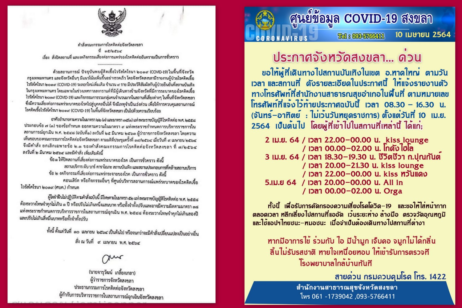 นอกจากนี้ สาธารณสุข จ.สงขลา ยังได้ออกประกาศด่วน ขอให้ผู้ที่เดินทางไปสถานบันเทิงใน อ.หาดใหญ่ ในช่วงวันที่ 2 เม.ย. 64 เวลา 22.00-00.00 น. ร้าน kiss lounge และเวลา 00.00-02.00 น. ร้านโกดัง ไฮโล รวมทั้งวันที่ 3 เม.ย. 64 เวลา 18.30-19.30 น. ร้านชีวิตชีวา , เวลา 20.00-21.30 น. ร้าน kiss lounge , เวลา 22.00-00.00 น. ร้าน kiss หวันแดง และในวันที่ 5 เม.ย. 64 เวลา 20.00-00.00 น. ร้าน All in และเวลา 00.00-02.00 น. ร้าน Orga ให้แจ้งรายงานตัวทางโทรศัพท์ที่สำนักงานสาธารณสุขอำเภอในพื้นที่ตามหมายเลขโทรศัพท์ที่แจ้งไว้ท้ายประกาศฉบับนี้ในช่วงเวลา 08.30-16.30 น. ได้ทุกวันไม่เว้นวันหยุดราชการ ตั้งแต่วันที่ 10 เม.ย. 64 เพื่อรับการคัดกรองความเสี่ยงโรคโควิด เนื่องจากมีผู้ป่วย 1 ราย เป็นชายอายุ 40 ปี ซึ่งป่วยและมีเพื่อนจากจ.ฉะเชิงเทรา ที่ติดเชื้อโควิดมาเยี่ยม ทำไห้ได้รับเชื้อจากนั้นได้เดินทางไปเที่ยวร้านอาหารและสถานบันเทิงตามที่ปรากฎดังกล่าว.