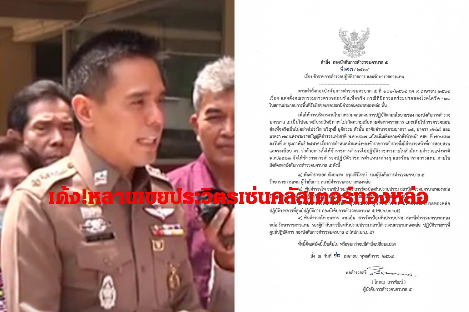 พล.ต.ต. โสภณ สารพัฒน์ ผู้บังคับการตำรวจนครบาล 5 ลงนามในคำสั่ง เรื่อง ข้าราชการตำรวจปฏิบัติราชการ และรักษาราชการแทน โดยรายละเอียดระบุว่า ตามคำสั่งกองบังคับการตำรวจนครบาล 5 ที่ 102/2564 ลงวันที่ 9 เมษายน 2564 เรื่อง แต่งตั้งคณะกรรมการตรวจสอบข้อเท็จจริง กรณีที่มีการแพร่ระบาดของโรคโควิด-19 ในสถานประกอบการพื้นที่รับผิดชอบของสถานีตำรวจนครบาลทองหล่อ นั้น