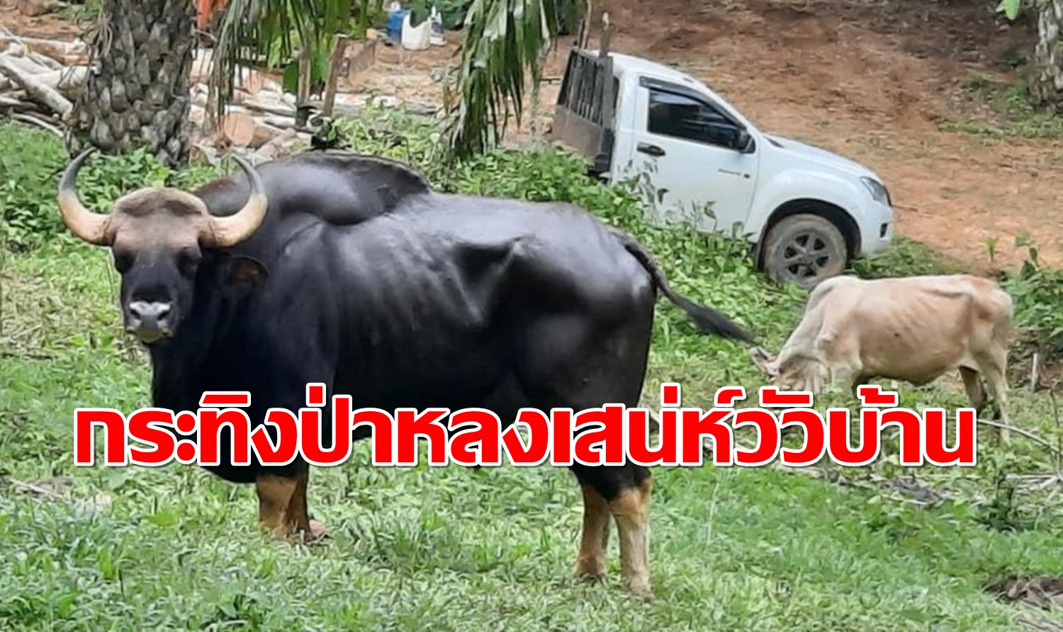 กระทิงหนุ่มคึกหลงวัวสาวพื้นบ้านตามเฝ้าแจไม่ยอมกลับเข้าป่าลึก