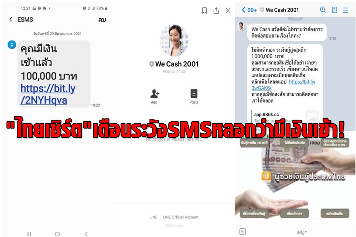 ศูนย์ประสานการรักษาความมั่นคงปลอดภัยระบบคอมพิวเตอร์ประเทศไทย (ไทยเซิร์ต) สำนักงานพัฒนาธุรกรรมทางอิเล็กทรอนิกส์ (องค์การมหาชน) ได้รายงานผ่านเว็บไซต์ ว่า เมื่อวันที่ 16 เมษายน 2564 ไทยเซิร์ตได้รับแจ้งเกี่ยวกับข้อความหลอกลวงทาง SMS ที่มีจุดประสงค์เพื่อชักชวนติดตั้งแอปพลิเคชันนอก Play Store และขอข้อมูลส่วนบุคคลสำหรับสมัครกู้เงิน โดยหลังจากที่ผู้ใช้งานคลิกลิงก์ใน SMS จะถูกเชิญให้แอดบัญชี LINE ชื่อ We Cash 2001 ซึ่งจะส่งข้อความชักชวนให้กดลิงก์เพื่อติดตั้งแอปพลิเคชันดังรูป