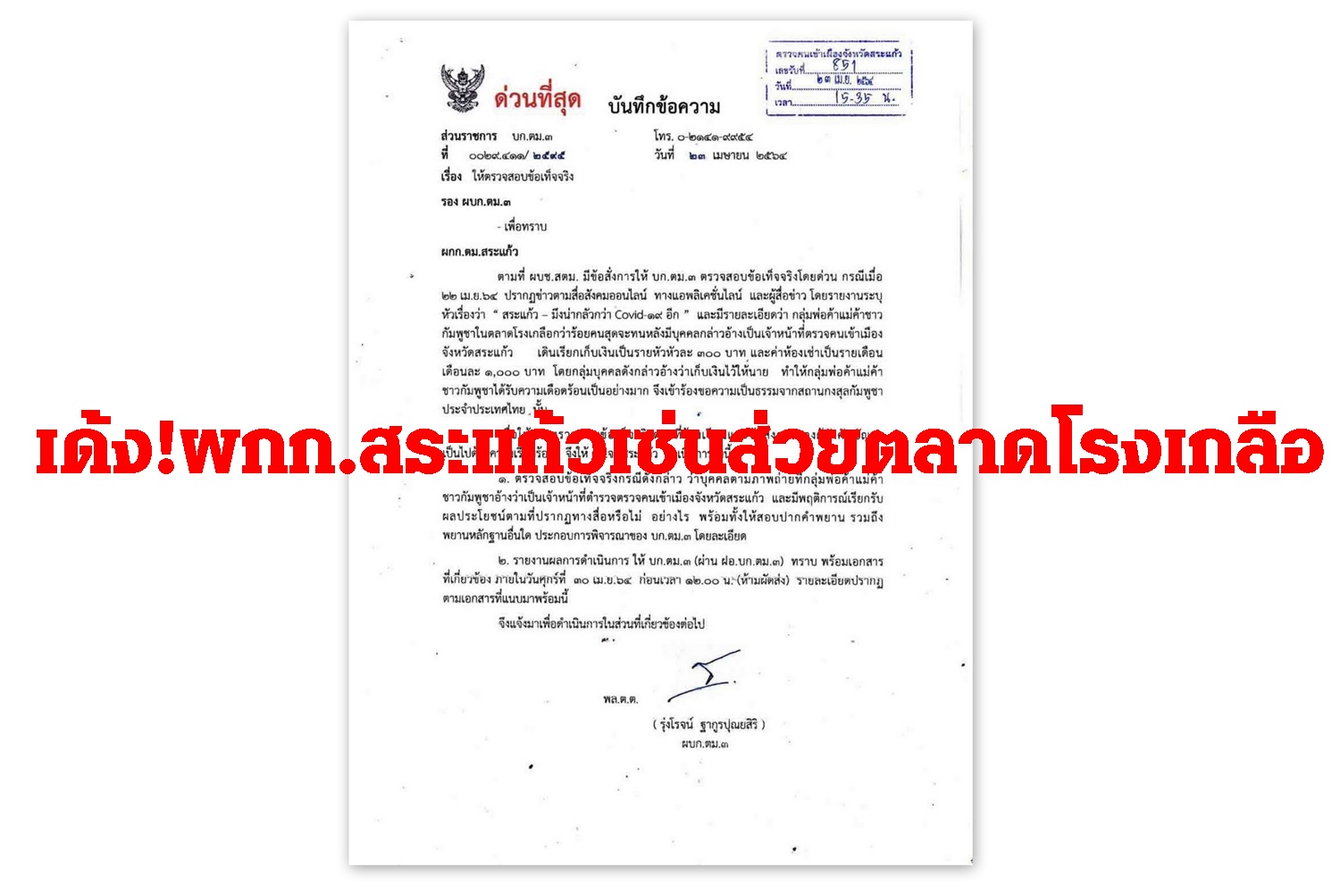 พล.ต.ต.รุ่งโรจน์ ฐากูรปุณยสิริ ผบก.ตม.3 ทำหนังสือด่วนที่สุด ที่0029.411/2564 ลงวันที่ 23 เมษายน เรื่อง ให้ตรวจสอบข้อเท็จจริง กรณีสื่อมวลชนเสนอข่าวทางสื่อออนไลน์ว่า กลุ่มพ่อค้าแม่ค้าตลาดโรงเกลือสุดจะทนฯ และมีการเดินเรียกเก็บเงินเป็นรายหัว ๆ 300 บาทและค่าเช่าห้องเป็นรายเดือนๆ ละ 1,000 บาท โดยกลุ่มบุคคลดังกล่าวอ้างว่า เก็บเงินให้นาย ทำให้พ่อค้าแม่ค้าชาวกัมพูชาได้รับความเดือดร้อนเป็นอย่างมาก จึงเข้าร้องขอความเป็นธรรมจากสถานกงสุลกัมพูชาประจำประเทศไทย เพื่อตรวจสอบข้อเท็จจริง จึงให้ ตม.สระแก้ว ดำเนินการดังนี้