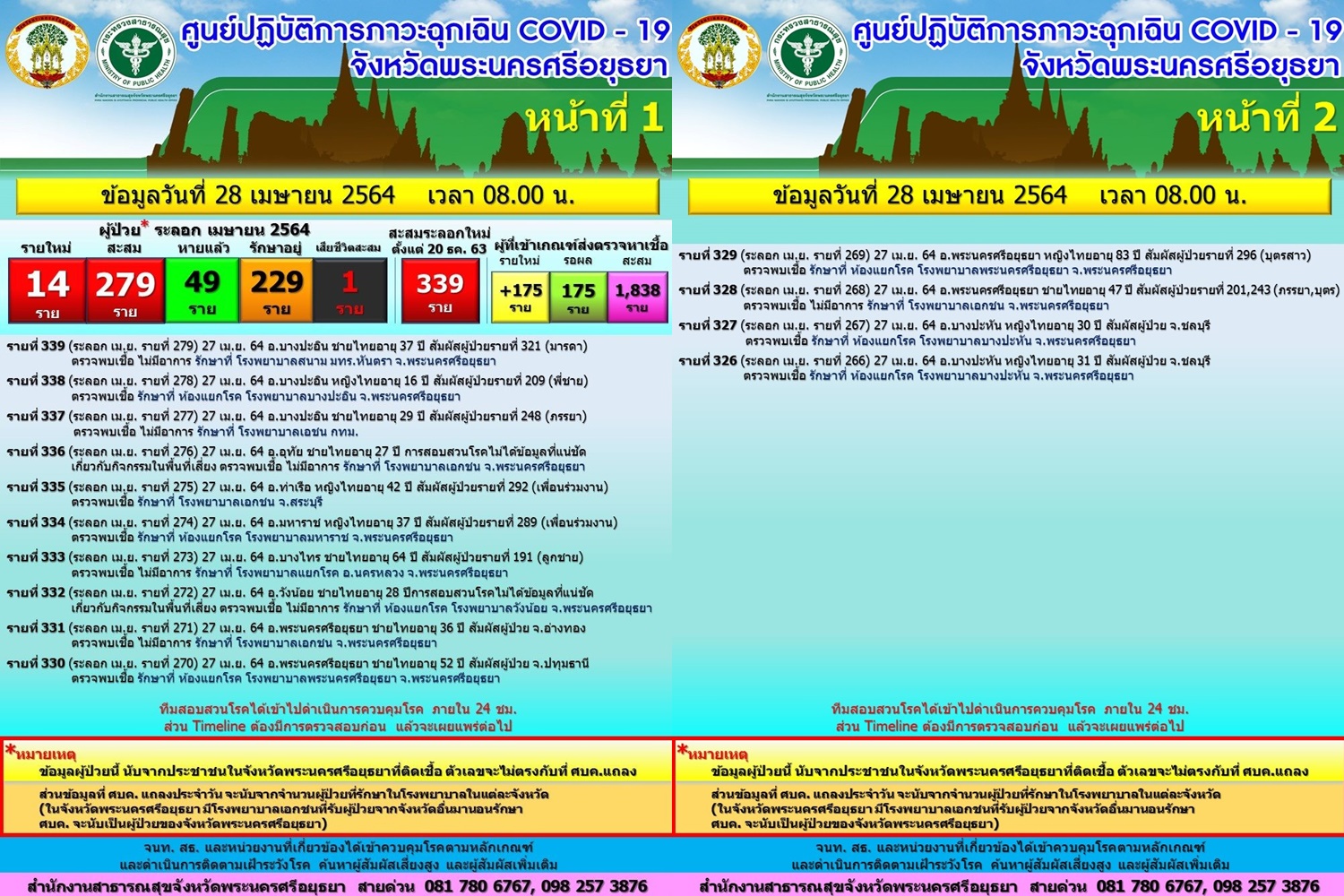 เมื่อวันที่ 28 เม.ย.64 ที่จ.พระนครศรีอยุธยา มีรายงานสถานการณ์โรคโควิด-19ระบาดว่า วันนี้พบผู้ติดเชื้อโควิด-19รายใหม่ เพิ่มขึ้นอีก 14 คน ทำให้มียอดสะสม 339 คน เฉพาะเดือนเมษายนซึ่งเป็นการระบาดรอบ3มียอดสะสมที่ 279 คน ทั้งหมดยังต้องพักรักษาตัวในโรงพยาบาลต่อไปอีก 229 คน และมียอดผู้เสียชีวิต 1 คน