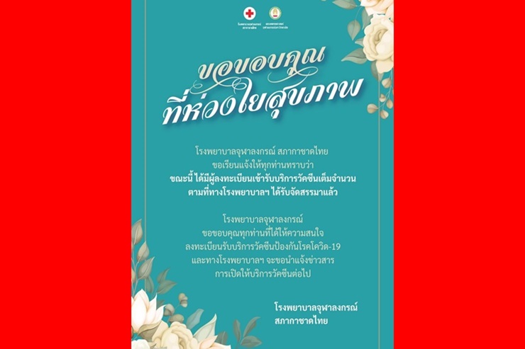 โรงพยาบาลจุฬาฯ แจ้งมีคนลงทะเบียนรับวัคซีนเต็มจำนวน ตามที่ทางรพ. ได้รับจัดสรร แล้ว