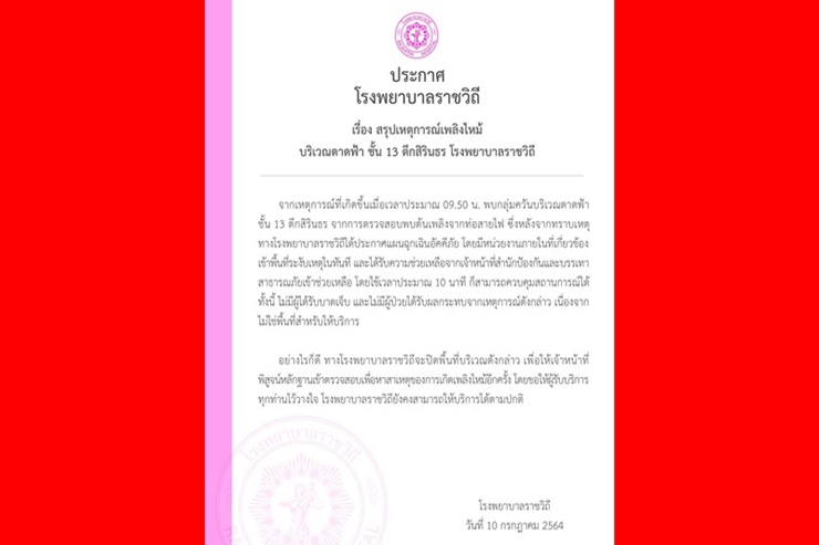 อย่างไรก็ดี ทางโรงพยาบาลราชวิถี จะปิดพื้นที่บริเวณดังกล่าว เพื่อให้เจ้าหน้าที่พิสูจน์หลักฐานเข้าตรวจสอบ เพื่อหาสาเหตุของการเกิดเพลิงไหม้อีกครั้ง โดยขอให้ผู้รับบริการทุกท่านวางใจ โรงพยาบาลราชวิถียังคงสามารถให้บริการได้ตามปกติ