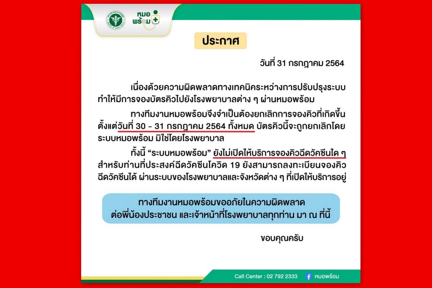 แฟนเพจเฟซบุ๊ก หมอพร้อม แจ้งว่า มีความผิดพลาดระหว่างการปรับปรุงระบบ ทำให้มีการจองบัตรคิวไปยังโรงพยาบาลต่างๆ ผ่านหมอพร้อม จึงจำเป็นต้องยกเลิกคิวที่เกิดขึ้นในวันที่ 30-31 ก.ค. 2564 ทั้งหมด