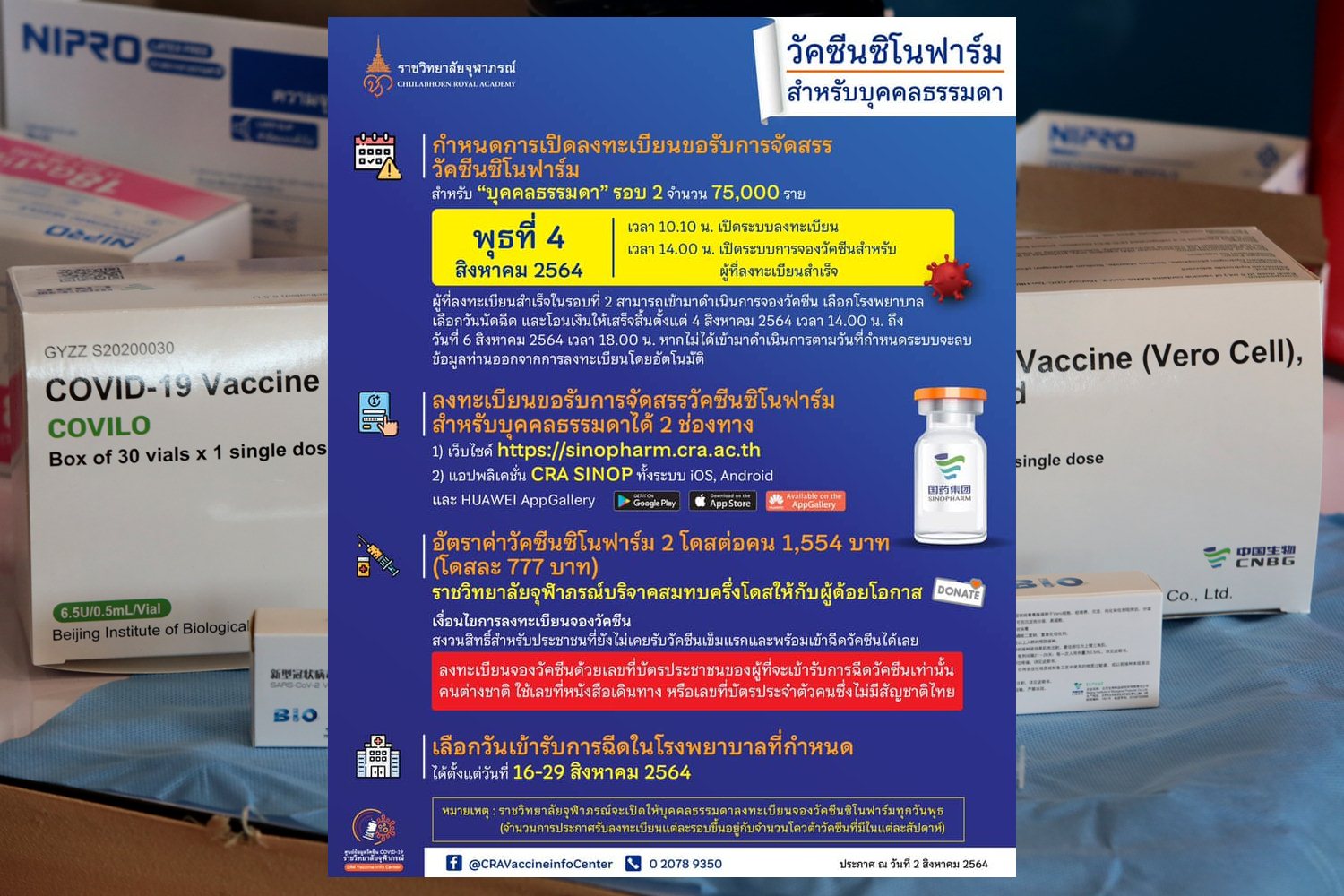 ราชวิทยาลัยจุฬาภรณ์ ประกาศ แจ้งกำหนดการเปิดลงทะเบียนขอรับการจัดสรรวัคซีน “ซิโนฟาร์ม” สำหรับ “บุคคลธรรมดา” รอบ 2 จำนวน 75,000 ราย ในวันพุธที่ 4 ส.ค. 64 ดังนี้