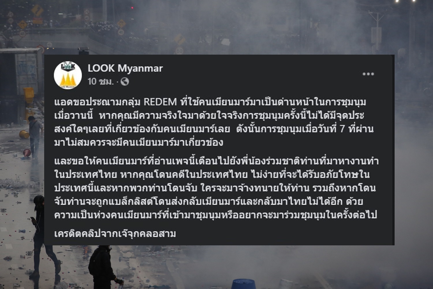 เพจ LOOK Myanmar ประณามกลุ่ม REDEM ใช้คนเมียนมาเป็นด่านหน้าในการชุมนุมวันที่ 7ส.ค.64 พร้อมเตือนคนเมียนมาไม่สมควรเข้าไปเกี่ยวข้องเสี่ยงถูกจับกุมโดนแบล็กลิสต์ส่งกลับประเทศ