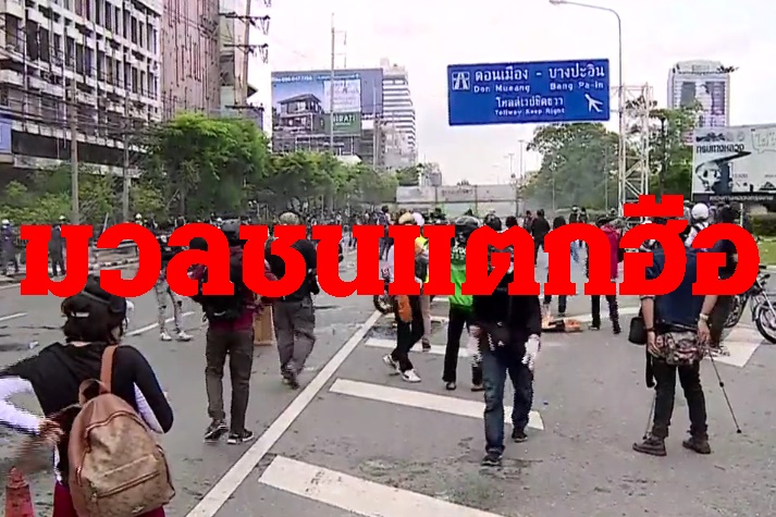 กลุ่มมวลชนทะลุฟ้าแตกฮือ หน้าแนวกั้นตู้คอนเทนเนอร์ หลังมีเสียงดังคล้ายระเบิด ตำรวจอคฝ.ไม่ยอมให้เข้าไป