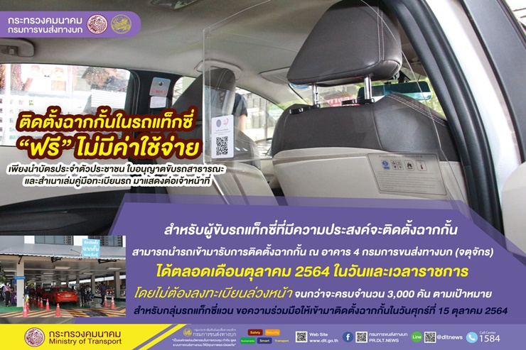 นายจิรุตม์ วิศาลจิตร อธิบดีกรมการขนส่งทางบก เปิดเผยว่า ตามที่กรมการขนส่งทางบก ร่วมกับ เอสซีจี เคมิคอลส์ ดำเนินโครงการติดตั้งฉากกั้นในรถแท็กซี่ “ฟรี” ไม่มีค่าใช้จ่าย เพื่อเว้นระยะห่างระหว่างผู้ขับรถและผู้โดยสาร ลดความเสี่ยงจากการสัมผัสละอองฝอย ป้องกันการแพร่กระจายของเชื้อโควิด-19 ซึ่งเป็นการดำเนินงานภายใต้โครงการยกระดับความปลอดภัยและความมั่นใจในการใช้บริการรถยนต์รับจ้างบรรทุกคนโดยสารไม่เกินเจ็ดคน เริ่มดำเนินการติดตั้งตั้งแต่วันที่ 16 กันยายน 2564 ที่ผ่านมา สามารถติดตั้งฉากกั้นได้แล้ว 2,192 คัน จากที่ตั้งเป้าไว้จำนวน 3,000 คัน โดยได้รับความร่วมมือจากลุ่มสหกรณ์ สมาคม และสมาพันธ์แท็กซี่กลุ่มต่าง ๆ นำรถเข้ารับการติดตั้งอย่างต่อเนื่อง ซึ่งกำหนดให้มีการติดตั้งจนถึงปลายเดือนตุลาคม 2564