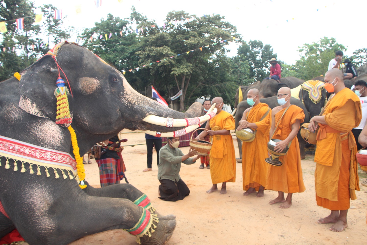 สุรินทร์-สำนักสงฆ์วัดป่าอาเจียงจัดตักบาตร เทโวโรหณะ ออกพรรษา นำช้างแสนรู้ 20 เชือก ร่วมทำบุญใส่บาตร