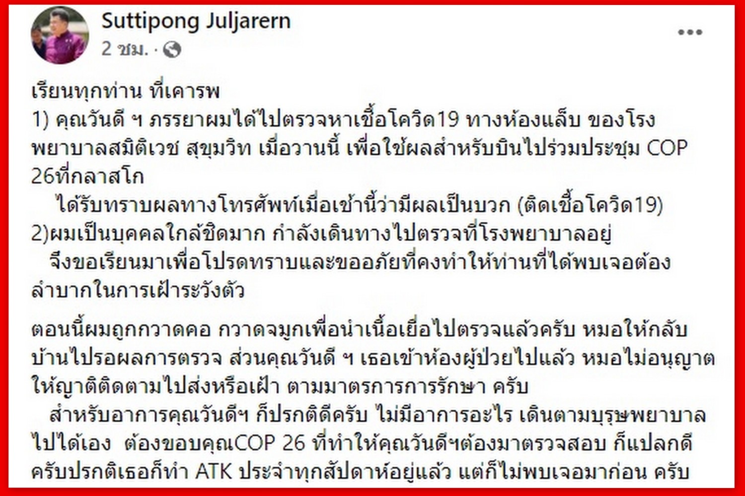 สุทธิพงษ์ ปลัดมหาดไทย โพสต์เฟซบุ๊กแจ้งข่าว ภรรยา ติดโควิด เตรียมบินร่วมประชุม COP 26 ที่กลาสโก เจ้าตัวรีบไปตรวจหาเชื้อแล้ว