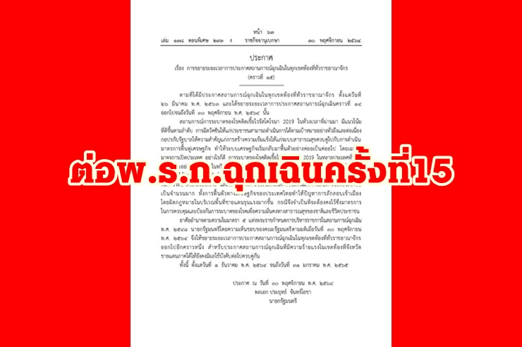 ราชกิจจานุเบกษา เผยแพร่ ประกาศ การขยายระยะเวลาการประกาศสถานการณ์ฉุกเฉินในทุกเขตท้องที่ทั่วราชอาณาจักร (คราวที่ 15 ) โดยระบุว่า ตามที่ได้มีประกาศสถานการณ์ฉุกเฉินในทุกเขตท้องที่ทั่วราชอาณาจักร ตั้งแต่วันที่ 26 มีนาคม พ.ศ. 2563 และได้ขยายระยะเวลาการประกาศสถานการณ์ฉุกเฉินคราวที่ 14 ออกไปจนถึงวันที่ 30 พฤศจิกายน พ.ศ. 2564 นั้น