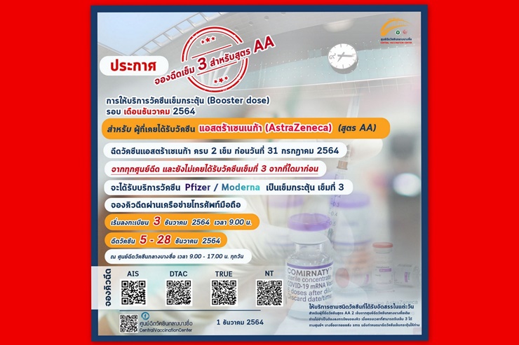 สามารถจองคิวฉีดวัคซีนผ่านเครือข่ายมือถือ AIS DTAC TRUE และ NT โดยเริ่มลงทะเบียนวันที่ 3 ธ.ค. 64 เวลา 9.00 น. เป็นต้นไป และจะได้รับการฉีดวัคซีนในวันที่ 5 - 28 ธ.ค. 64