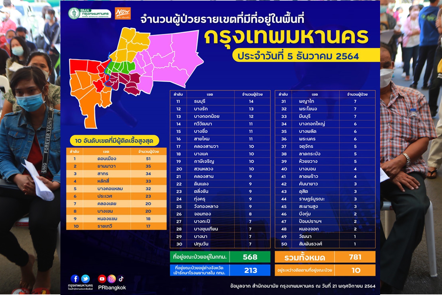 เมื่อวันที่ 5 ธันวาคม สำนักงานประชาสัมพันธ์ กทม.ได้รายงานจำนวนผู้ติดเชื้อโควิดรายเขตวันนี้ทั้ง 50 เขต มีทั้งหมด 781 ราย โดยพบผู้ป่วยในทุกเขต ขณะที่เขตวัฒนา และสัมพันธวงศ์ พบผู้ป่วยน้อยที่สุดเขตละ 1 ราย เท่านั้น