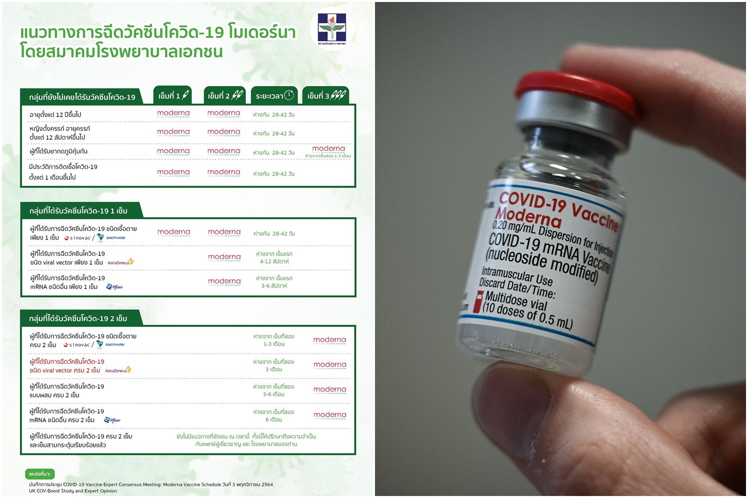 เมื่อวันที่ 13 ธ.ค. 64 สมาคมโรงพยาบาลเอกชนได้สรุปแนวทางการฉีดวัคซีนโควิด-19 โมเดอร์นา โดยอ้างอิงจากการประชุมเกี่ยวกับแนวทางการฉีดวัคซีนโควิด-19 โมเดอร์นา ซึ่งจัดขึ้นในวันที่ 3 พฤศจิกายน 2564 โดยมีผู้เชี่ยวชาญจากโรงเรียนแพทย์ โรงพยาบาลเอกชน และองค์การเภสัชกรรม มาร่วมปรึกษาและให้ข้อคิดเห็นเกี่ยวกับตารางการฉีดวัคซีนโควิด-19 โมเดอร์นา เพื่อให้โรงพยาบาลต่างๆ ในเครือสมาคมโรงพยาบาลเอกชนทั่วประเทศนำไปเลือกใช้ตามความเหมาะสมสำหรับกลุ่มต่างๆ