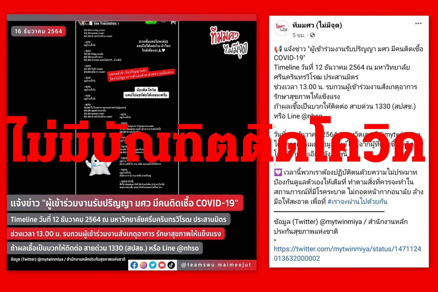 ในช่วงวันที่ 12,14,15 ธ.ค.64 ซึ่งมีบัณฑิตมาร่วมซ้อมรับปริญญา ทางมศว เราตรวจ ATKทุกครั้งปีนี้จะมีบัณฑิตจบใหม่เข้าร่วมงานพิธีรับพระราชทานปริญญาตรีวันที่17ธ.ค.64จำนวน 2,800คน" ผศ.ว่าที่ร้อยตรี ดร.กิตติคุณ กล่าว ผู้สื่อข่าวรายงานว่า ก่อนหน้านี้ มีการแจ้งข่าวผ่านโซเชียลว่า ผู้เข้าร่วมงานรับปริญญา มศว มีคนติดเชื้อโควิด ไทม์ไลน์ เมื่อวันที่12ธ.ค.64 ณ มหาวิทยาลัยศรีนครินทรวิโรฒ ประสานมิตร วันที่16ธ.ค.64 ทางทวิตเตอร์ @mytwinmiya ได้เปิดเผยข้อมูลไทม์ไลน์จากผู้ติดเชื้อโควิด-19 กระทั่ง มศว ออกมาชี้แจงข้อเท็จจริง