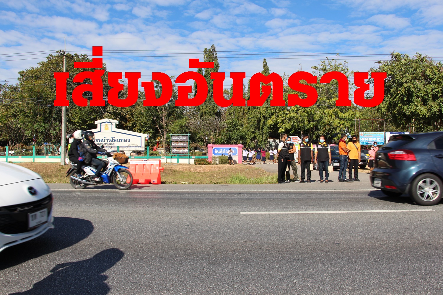 ขณะที่บริเวณหน้าโรงเรียนแห่งนี้ก็ไม่ได้มีป้ายเตือนอันตราย หรือมีสัญญาณไฟจราจรเตือนให้ลดความเร็วแต่อย่างใด เสี่ยงที่จะเกิดอุบัติเหตุกับเด็กนักเรียนขึ้นได้โรงเรียนตั้งอยู่ฝั่งตรงข้ามถนนกับหมู่บ้าน ทำให้เวลานักเรียนมาโรงเรียนจึงต้องวิ่งข้ามถนนที่มีความกว้างและมีร่องลึกคั่นกลางถนน เป็นอุปสรรคในการข้ามโดยเฉพาะกับเด็กเล็ก โดยจะมีคุณครูจัดเวรกันนำเด็กนักเรียนข้ามถนนไปมาทุกวัน