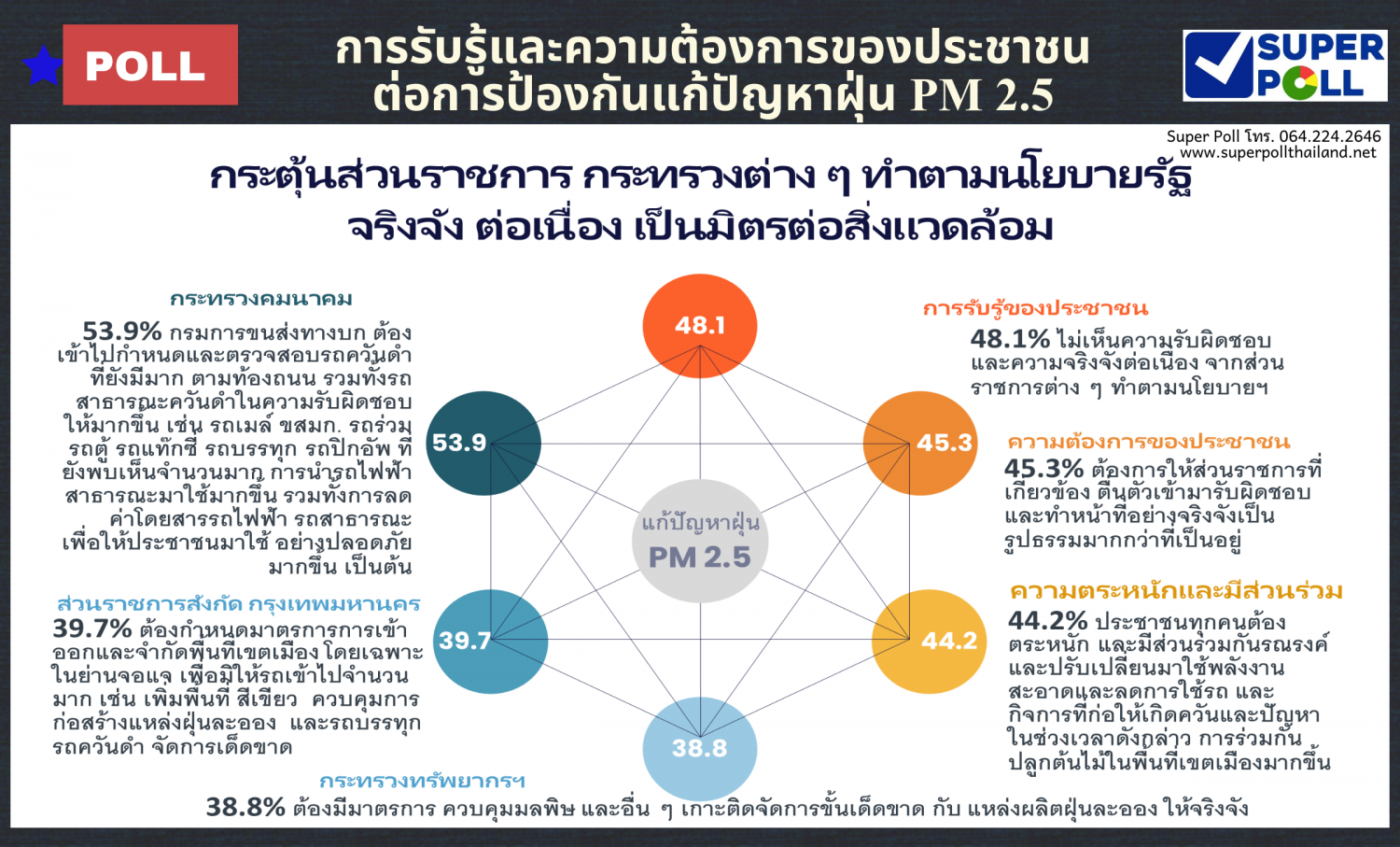ผอ.ซูเปอร์โพล กล่าวว่า ผลการศึกษาการรับรู้และความต้องการของประชาชนครั้งนี้ ชี้ให้เห็นว่า สิ่งที่ประชาชนรับรู้กับความเป็นจริงที่เป็นอยู่คือ ส่วนราชการกระทรวงต่าง ๆและ กทม. ที่เกี่ยวข้อง ยังไม่ได้สร้างการรับรู้ ตื่นตัวและยังไม่แข็งขันจริงจังกับการแก้ปัญหาฝุ่นละออง PM 2.5 ในกรุงเทพมหานครและปริมณฑล ในเชิงประจักษ์ ต่อข้อสั่งการของนายกรัฐมนตรีและนโยบายของรัฐบาล ขณะที่ภาคประชาสังคมที่เกี่ยวข้องและ ที่ได้รับผลกระทบ ยังไม่ตระหนักร่วม รวมทั้งได้รับการส่งเสริม สนับสนุนและมีส่วนร่วมกันอย่างเป็นรูปธรรมด้วยความเข้าใจร่วมกัน ยังไม่เห็นกระทรวงทรัพยากรธรรมชาติและสิ่งแวดล้อม ที่เป็นเจ้าภาพหลัก มีการติดตามขับเคลื่อนพัฒนาใหม่ๆที่แข็งขันและการเปลี่ยนแปลงที่ดีขึ้นในแต่ละปี ทั้งมาตรการป้องกันและการแก้ปัญหา ซึ่งหากปล่อยละเลยหรือไม่ให้ความสำคัญ จะกระทบกลุ่มเสี่ยงโดยตรง และตามมาด้วยปัญหาสุขภาพประชาชนและระบบสาธารณสุข ที่ต้องใช้งบประมาณดูแลอีกจำนวนมาก โดยเฉพาะ กทม.ซึ่งเป็นเมืองท่องเที่ยวอันดับหนึ่งของโลก ยังคงนิ่งเฉย ไม่ตื่นตัวนำเทคโนโลยีมาใช้หรือมีมาตรการต่างๆรองรับที่แข็งขัน