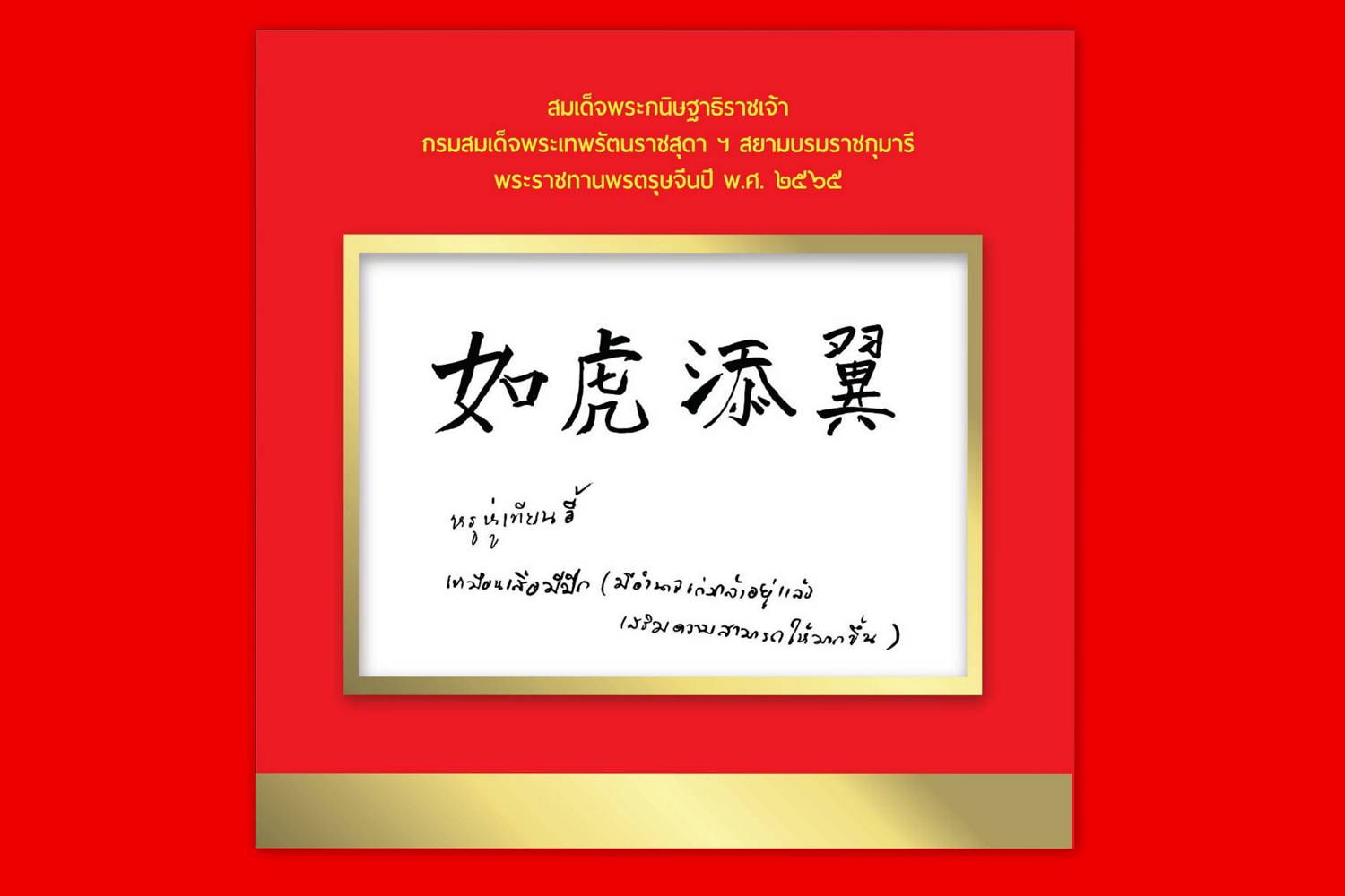 พรพระราชทานที่ปรากฏนี้ คือของขวัญพระราชทานจากพรพระราชทานของสมเด็จพระกนิษฐาธิราชเจ้า กรมสมเด็จพระเทพรัตนราชสุดา ฯ สยามบรมราชกุมารี ในปีขาล ๒๕๖๕ นี้ พรพระราชทานตามลายพระหัตถ์ภาษาจีน คือ 如虎添翼 อ่านว่า หรู หู่ เทียน อี้ พระองค์พระราชทานความหมายดังลายพระหัตถ์ว่า เหมือนเสือมีปีก (มีอำนาจเก่งกล้าอยู่แล้ว เสริมความสามารถให้มากขึ้น) ผู้ได้รับพรพระราชทานปีนี้นั้น จะเป็นเสือที่ทรงพลังมีอำนาจที่มีอยู่เดิมแล้ว ปีนี้จะเก่งกล้าสามารถ จะมีพลังและมีอำนาจมากขึ้น
