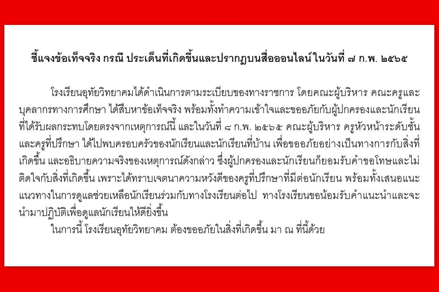 อย่างไรก็ตาม กรณีดังกล่าวนี้อาจจะเป็นการสื่อสารของทางครูและนักเรียนที่อาจจะเข้าใจไม่ตรงกัน เบื้องต้นก็ได้เข้าไปขอโทษ ทั้งนักเรียนและผู้ปกครองในส่วนที่เกิดความไม่เข้าใจกัน ซึ่งทางโรงเรียนก็ได้รับคำแนะนำจากผู้ปกครองในบางส่วน ในเรื่องของการตรวจสอบระเบียบวินัย ตลอดจนข้อเสนอแนะต่างๆ ซึ่งทางโรงเรียนก็จะนำไปดำเนินการแก้ไขต่อไป