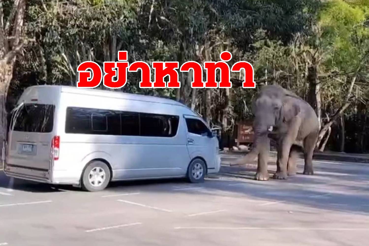 อย่าหาทำ!รถตู้เจอช้างป่าไม่ยอมถอยห่างเสี่ยงอันตราย