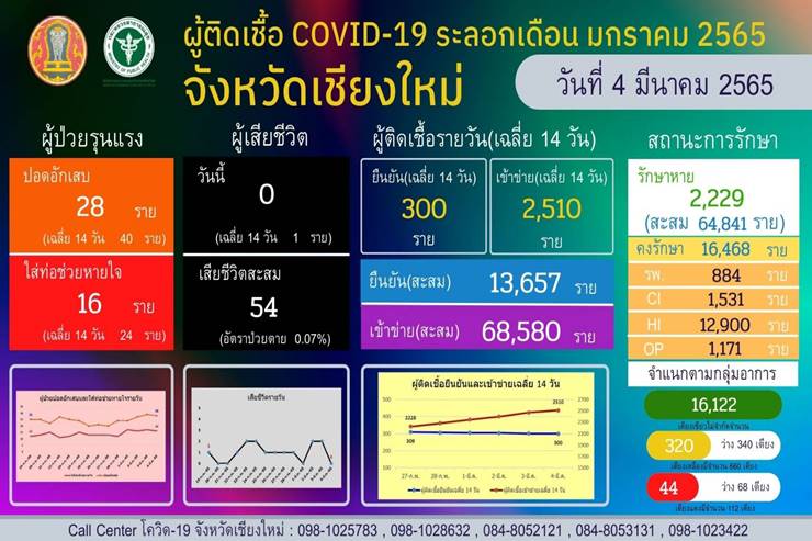สำหรับตัวเลขการแพร่ระบาดวันนี้พบว่า ผู้ติดเชื้อรายใหม่จากผล ATK ยังพบสูงทุกวันมากถึง 2,510ราย ผล RT-PCR 300รายรวม 2,810ราย ยอดค้างรักษาในทุกระบบวันนี้ 16,468 ราย จำนวนนี้มีป่วยหนัก44ราย ใส่เครื่องช่วยหายใจ 16ราย ยอดติดเชื้อสะสมตั้งแต่มกราคม 68,580ราย รักษาหาย 64,841ราย