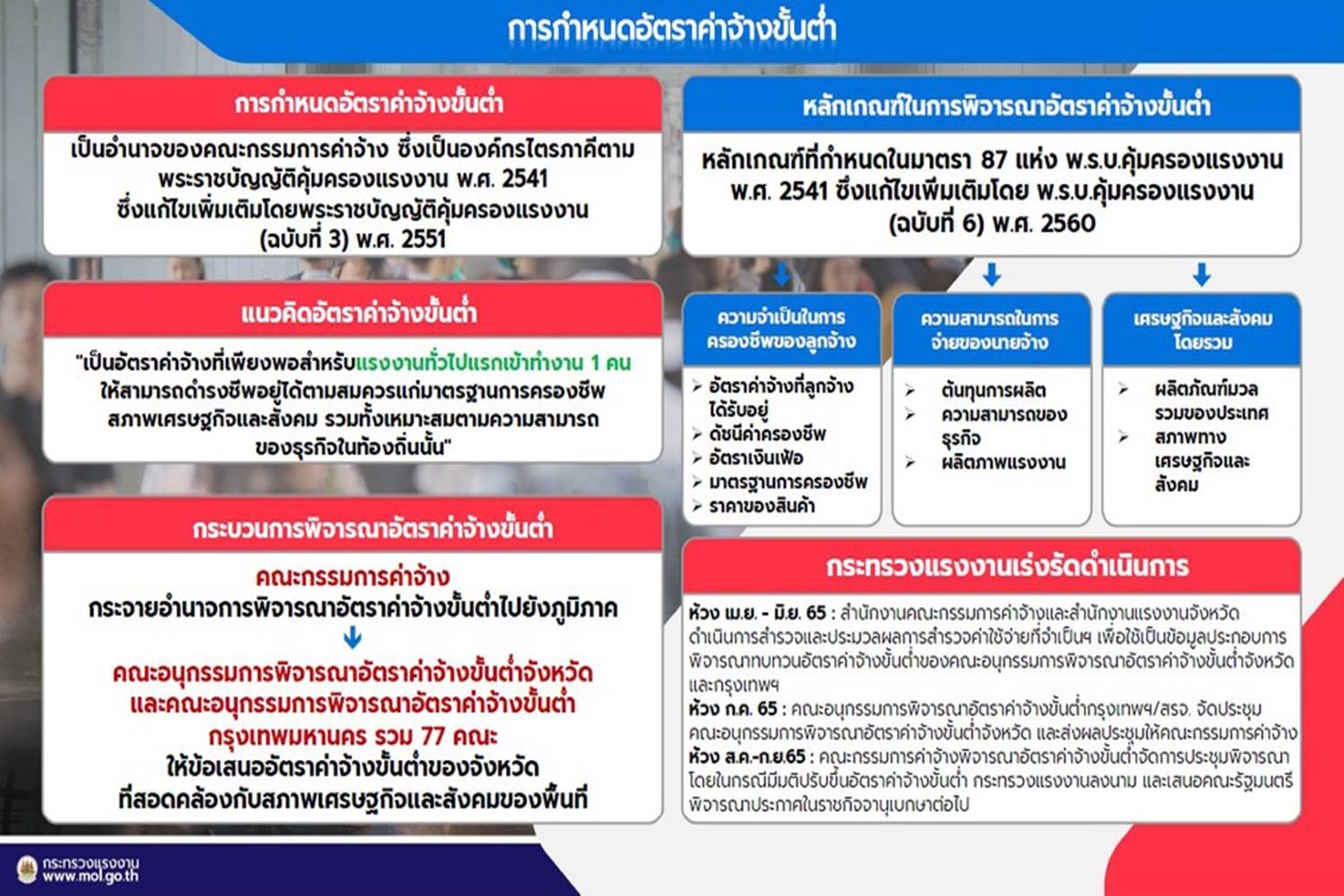 นายสุชาติ กล่าวว่า ในช่วงเดือน เม.ย.-มิ.ย. 65 เรื่องอัตราค่าจ้างขั้นต่ำจะอยู่ในขั้นตอนที่สำนักงานคณะกรรมการค่าจ้างและสำนักงานแรงงานจังหวัดดำเนินการสำรวจและประมวลผลค่าใช้จ่ายจำเป็น เพื่อใช้เป็นข้อมูลประกอบการพิจารณาทบทวนอัตราค่าจ้างขั้นต่ำของคณะอนุกรรมการพิจารณาอัตราค่าจ้างขั้นต่ำจังหวัดและกรุงเทพฯ