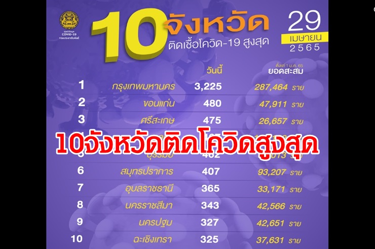 เมื่อวันที่ 29 เม.ย. 65 ศูนย์บริหารสถานการณ์การแพร่ระบาดของโรคติดเชื้อไวรัสโคโรนา 2019 (ศบค.) รายงานสถานการณ์การแพร่ระบาดของไวรัสโควิด-19 ในประเทศประจำวันดังนี้