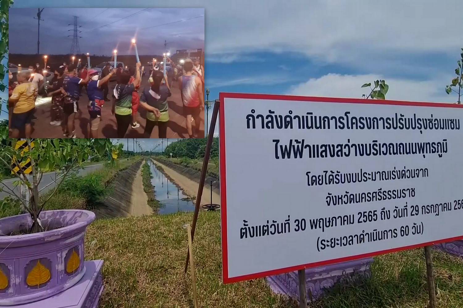ที่ถนนพุทธภูมิ รอยต่อระหว่างตำบลมะม่วงสองต้น ตำบลโพธิ์เสด็จ และตำบลในเมือง อำเภอเมืองนครศรีธรรมราช มีป้ายประกาศติดตั้งได้เมื่อไม่กี่ชั่วโมงที่ผ่านมา มีข้อความว่า กำลังดำเนินการโครงการปรับปรุงซ่อมแซมไฟฟ้าแสงสว่างบนถนนพุทธภูมิ โดยได้รับงบประมาณเร่งด่วนจากจังหวัดนครศรีธรรมราช ในเวลา 60 วัน ตั้งแต่วันที่ 30 พฤษภาคม 2565 จนถึง 29 กรกฎาคม 2565 แต่ไม่ได้ระบุว่าต้องใช่วงเงินเท่าไหร่ ป้ายนี้เกิดขึ้นหลังจากเมื่อวันเสาร์ที่ 28 พฤษภาคม ที่ผ่านมา นักวิ่งยามเย็นในสวนสาธารณะและบนถนนพุทธภูมิได้รวมตัวนำคบไฟมาจุดให้แสงสว่าง ขณะเดียวกันได้มีรถเครื่องเสียงเปิดไฟแสงสีพร้อม มาให้ความบันเทิงก่อนที่นักวิ่งจะตั้งขบวนวิ่งออกจากหน้าสวนหลวง ร.9 ไปบนถนนพุทธภูมิ ที่อยู่ในสภาพไฟฟ้าส่องสว่างบนถนนมืดสนิท ขณะเดียวกันรถเครื่องเสียงพร้อมไฟแสงสีได้นำขบวนไปสร้างสีสันขณะที่นักวิ่งได้หยุดแดนซ์อย่างสนุกสนาน เป็นระยะตามเส้นทางตลอดเส้นทางที่มีความยาวกว่า 2 กิโลเมตร