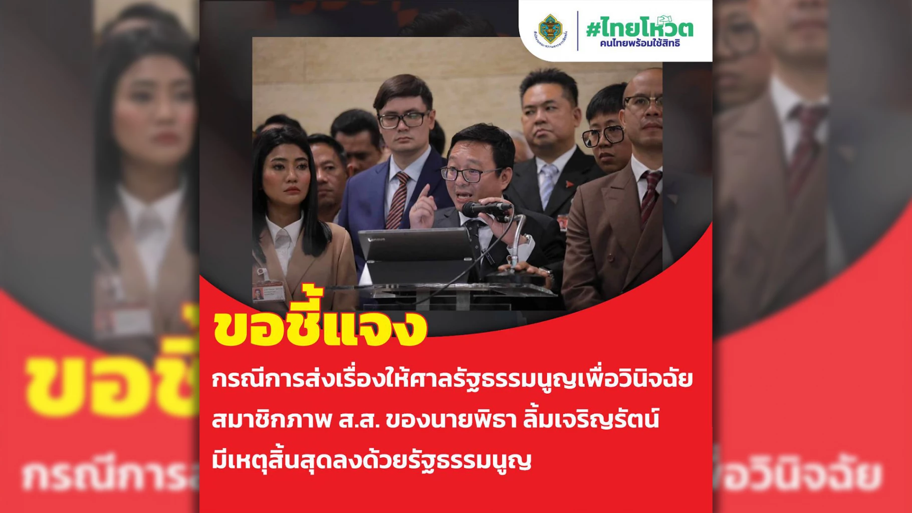 ส่วนข้อกล่าวอ้างว่า กกต. เร่งรัดพิจารณา และดำเนินการอย่างเร่งรีบ ไม่ละเอียดรอบคอบนั้น ขอชี้แจงว่า การดำเนินการของ กกต.เป็นเพียงกระบวนการรวบรวมพยานหลักฐานและข้อเท็จจริง โดยไม่ได้เป็นผู้วินิจฉัยชี้ขาดว่าบุคคลหนึ่งบุคคลใดมีเหตุสิ้นสุดสมาชิกภาพ