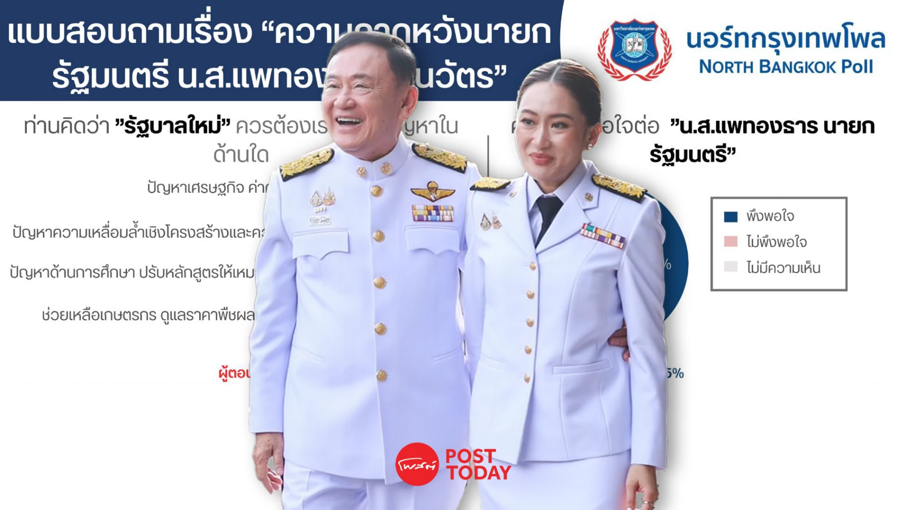 วันที่ 18 ส.ค. นายสานิต ศิริวิศิษฐ์กุล หัวหน้าแผนกวิจัย สำนักวิจัยมหาวิทยาลัยนอร์ทกรุงเทพ เปิดเผยว่า จากการสำรวจความเห็นเรื่อง "ความคาดหวังนายกรัฐมนตรี นางสาวแพทองธาร ชินวัตร ภายในวันที่ 17 สิงหาคม 2567 จำนวนผู้ตอบแบบสอบถาม 1,500 คนทั่วภูมิภาค โดยการสำรวจพบว่าการที่ นางสาวแพทองธาร ชินวัตร ขึ้นเป็นนายกรัฐมนตรี คนไทยมีความพึงพอใจ 57% ไม่พึงพอใจ 23% และ ไม่มีความเห็น 20%