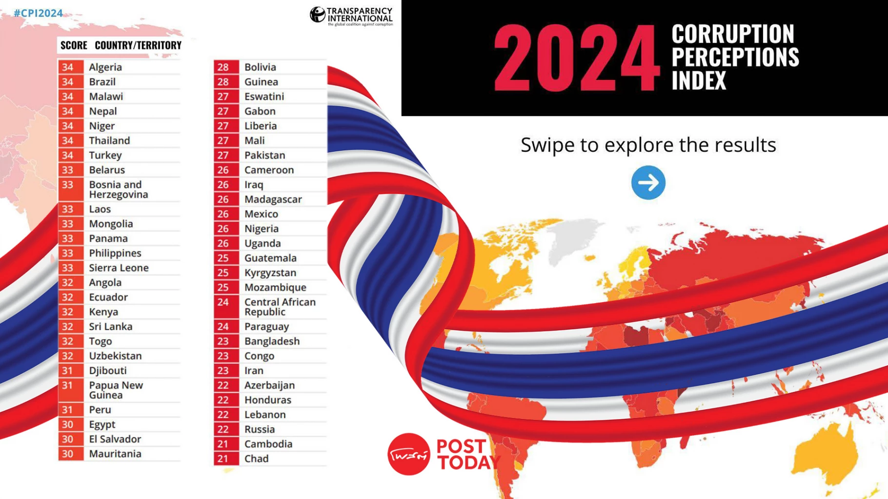 คะแนนคอร์รัปชั่นไทยปี 2567 ได้ 34 คะแนน อันดับที่ 107 ของโลก ดัชนีชี้ 20 ปี แทบไม่ขยับยังอยู่ในระดับน่าเป็นห่วง