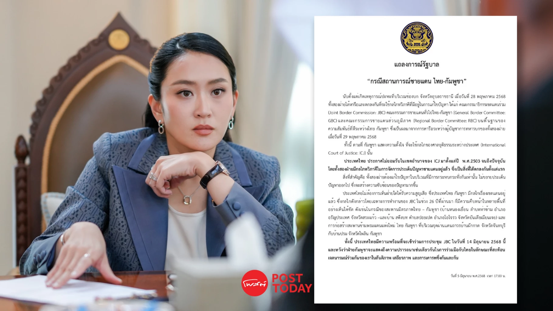 ทั้งนี้ ประเทศไทยมีความพร้อมที่จะเข้าร่วมการประชุม JBC ในวันที่ 14 มิถุนายน 2568 นี้และหวังว่า ฝ่ายกัมพูชาจะแสดงถึงความปรารถนาเช่นเดียวกันในการร่วมมือกับไทยในลักษณะที่สะท้อนเจตนารมณ์ร่วมกันของเราในสันติภาพ เสถียรภาพ และการเคารพซึ่งกันและกัน