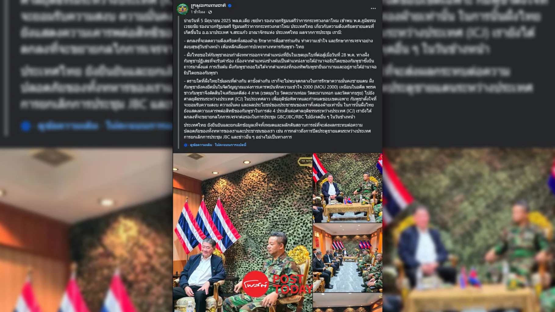 เพจกระทรวงกลาโหมกัมพูชา โพสต์ข้อความ กรณีที่นายภูมิธรรม เวชยชัย รองนายกรัฐมนตรีและรัฐมนตรีว่าการกระทรวงกลาโหมของไทย ได้หารือกับ พล.อ.เตีย เซ็ยฮา รองนายกรัฐมนตรีและรัฐมนตรีว่าการกระทรวงกลาโหมกัมพูชาเมื่อวันที่ 5 มิถุนายนที่ผ่านมา