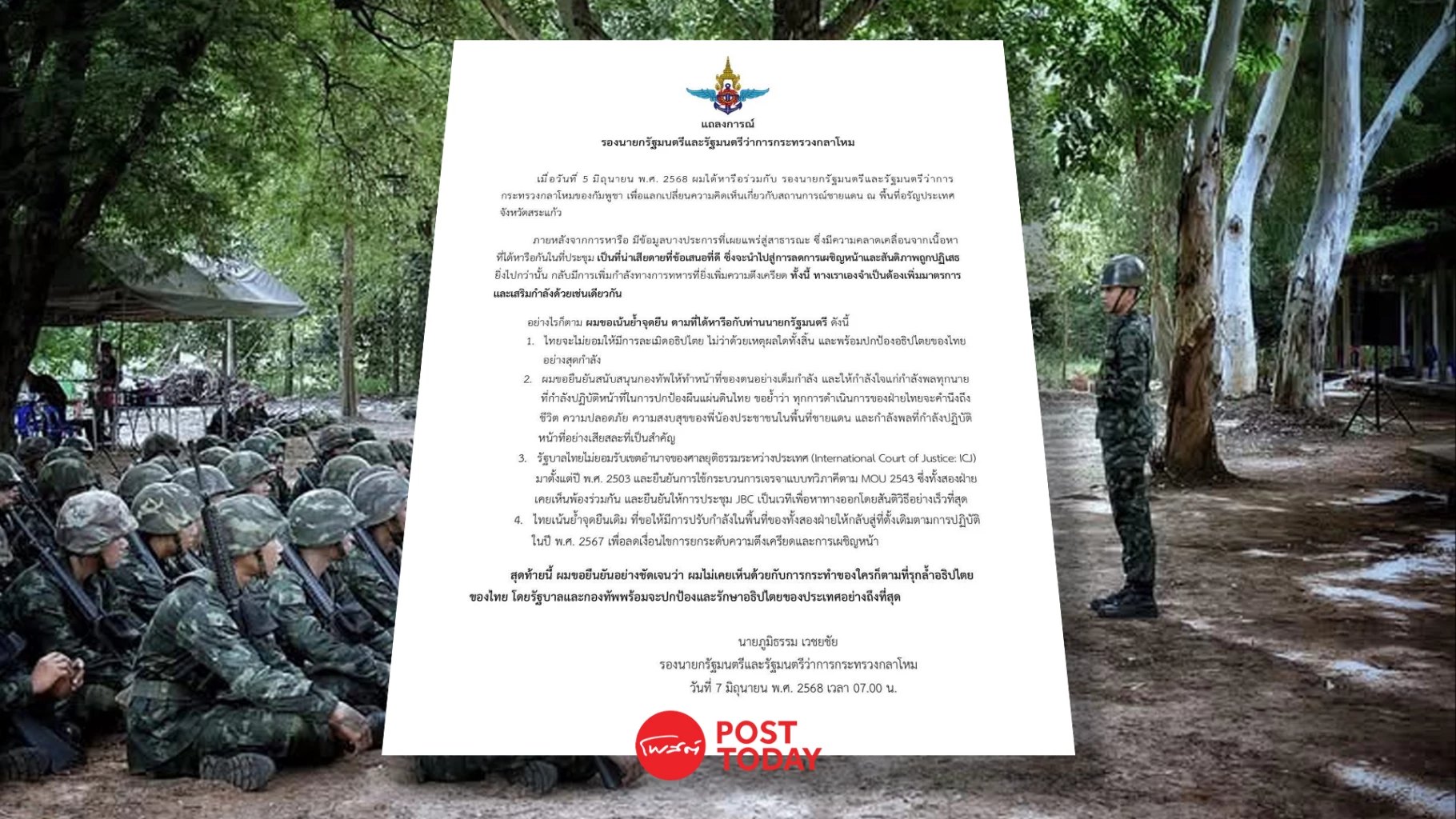 วันที่ 7 มิ.ย. เวลา 07.00 น. เพจ ไทยคู่ฟ้า ทำเนียบรัฐบาล เผยแพร่คำแถลงการณ์นายภูมิธรรม เวชยชัย รองนายกฯและรมว.กลาโหม ว่า เมื่อวันที่ 5 มิถุนายน พ.ศ. 2568 ผมได้หารือรวม.กับรองนายกรัฐมนตรีและรัฐมนตรีว่าการ กระทรวงกลาโหมของกัมพูชา เพื่อแลกเปลี่ยนความคิดเห็นเกี่ยวกับสถานการณชายแดน ณ พื้นที่อรัญประเทศ จังหวัดสระแก้ว