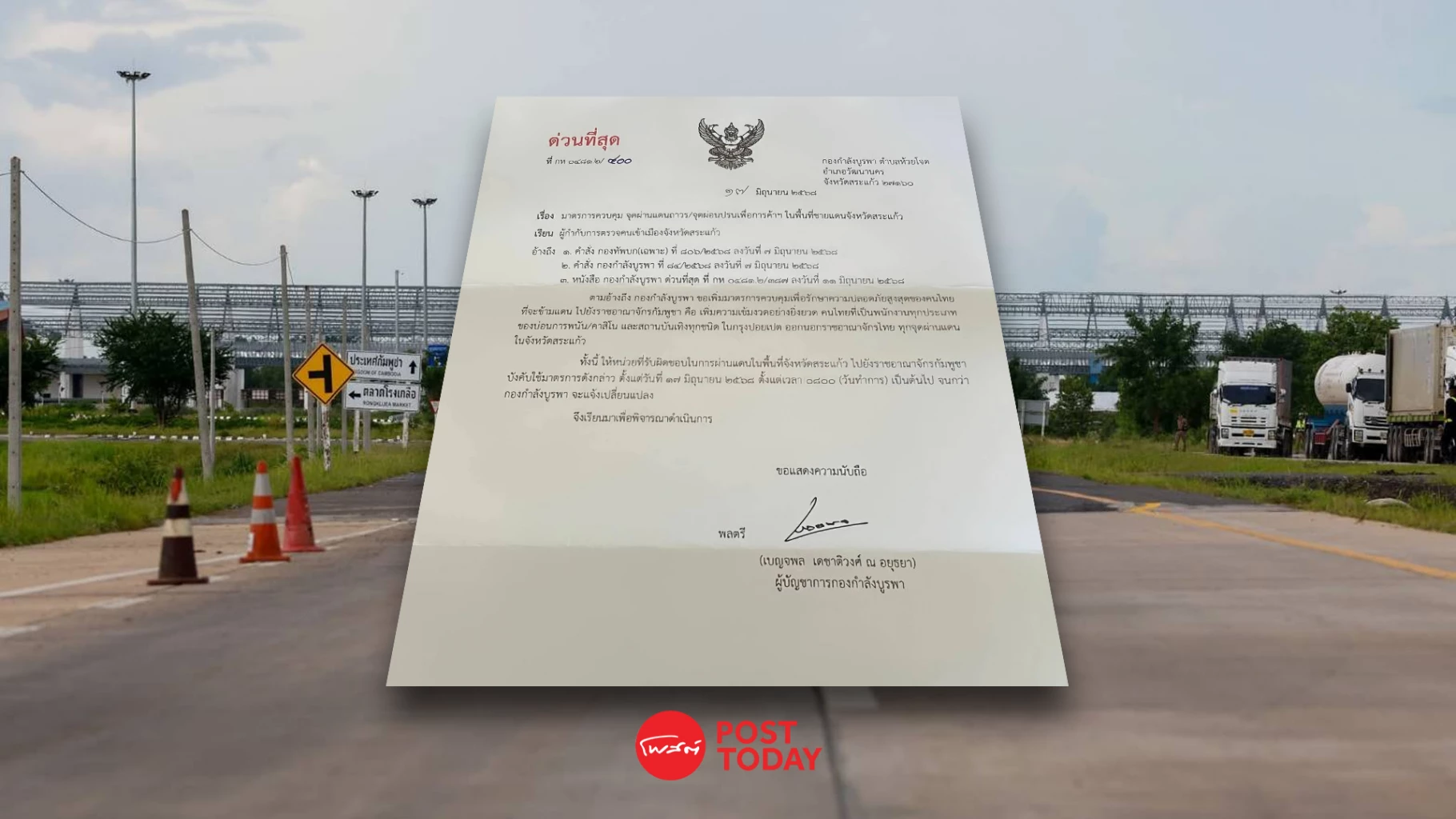 ทั้งนี้ ให้หน่วยที่รับผิดชอบในการผ่านแดนในพื้นพื้นที่จังหวัดสระแก้ว ไปยังราชอาณาจักรกัมพูชาบังคับใช้มาตรการดังกล่าว ตั้งแต่วันที่ 16 มิถุนายน 2568 ตั้งแต่เวลา 08.00 (วันทำการ) เป็นต้นต้นไปจนกว่ากองกำลังบูรพา จะแจ้งเปลี่ยนแปลงจึงเรียนมาเพื่อพิจารณาดำเนินการ
