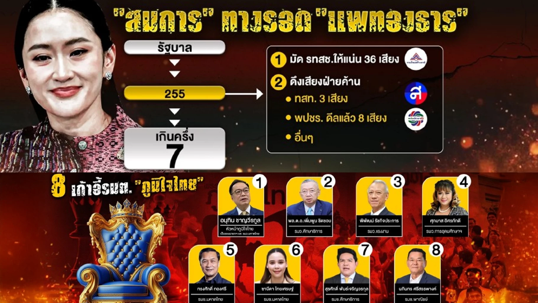 รัฐบาลเพื่อไทยเสียงหายเหลือ 255 ต้องหาเพิ่ม 15 เสียง หลังภูมิใจไทย ประกาศถอนตัวหากถูกยึดคืนเก้าอี้มหาดไทย จับตา8เก้าอี้รัฐมนตรีถูกเกลี่ยให้ฝ่ายสนับสนุนแพทองธาร