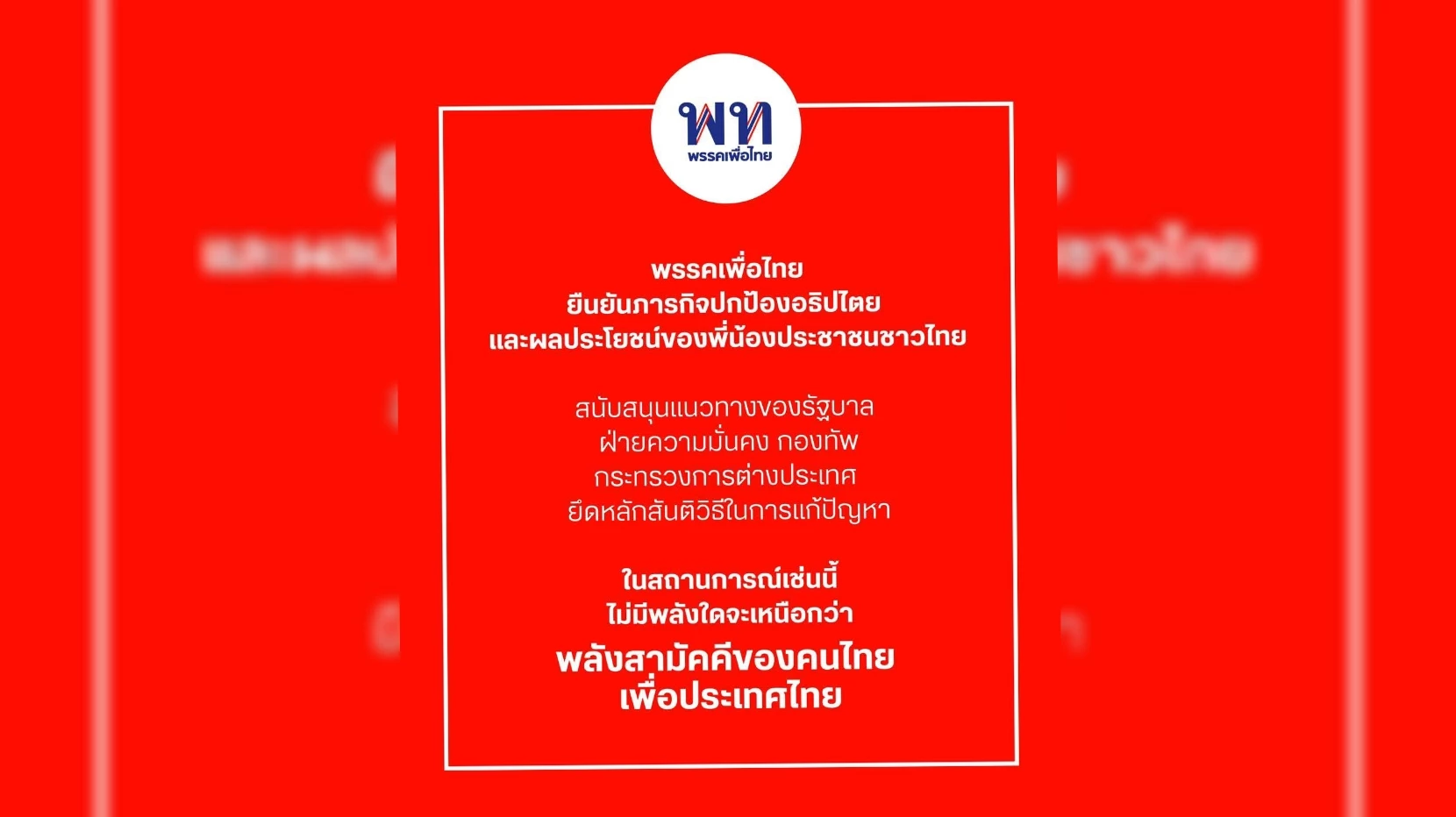 "พรรคเพื่อไทยยืนยันภารกิจปกป้องอธิปไตย และผลประโยชน์ของพี่น้องประชาชนชาวไทย