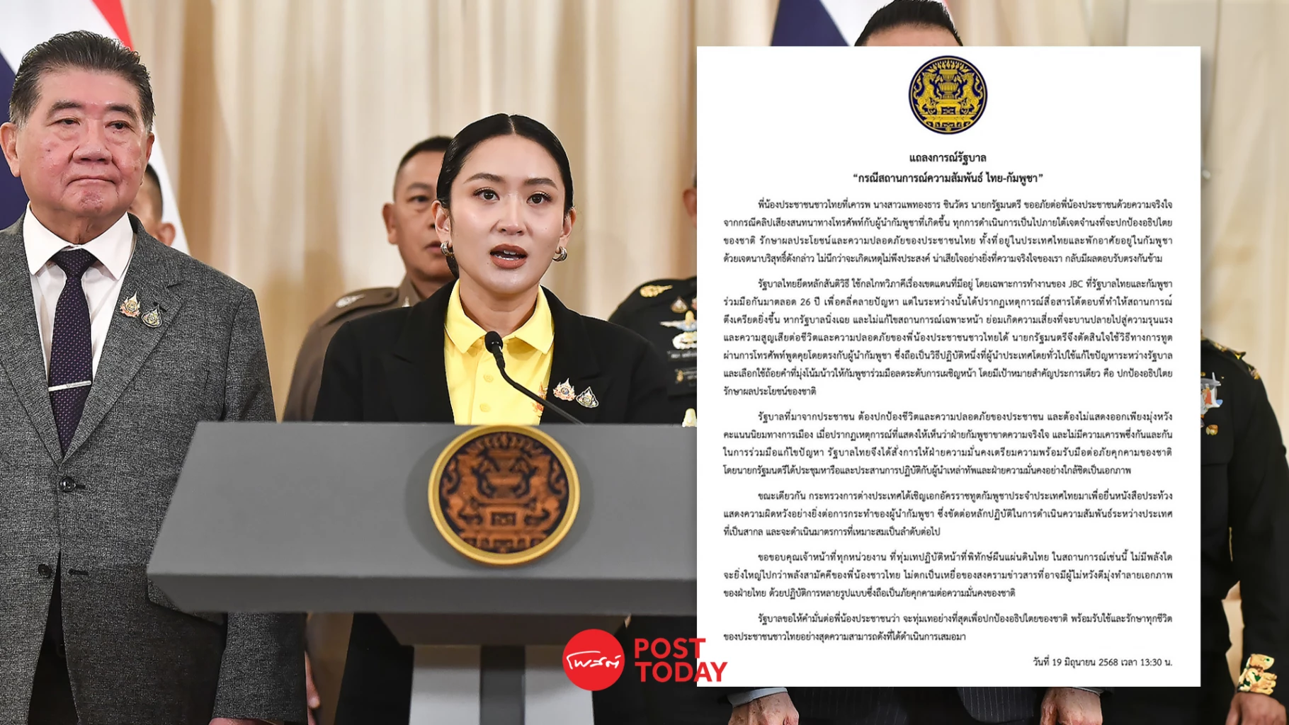 เมื่อวันที่ 19 มิถุนายน 2568 เวลา 13.30 น. แถลงการณ์รัฐบาล “กรณีสถานการณ์ความสัมพันธ์ ไทย-กัมพูชา”
